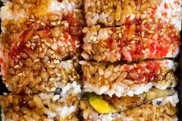 Shrimp tempura roll, with avocado, cucumber, lettuce, masago, and eel sauce.